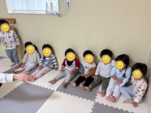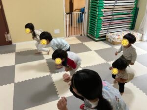 お部屋での運動遊び!「カエルさん!」「うさぎさん!」「くまさん!」など色んな動物に変身して移動を楽しんでいます。「次は何の動物さんかな?」保育者のお話しを聞いて、年上のお友だちを見て真似っこする子も😊