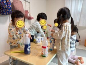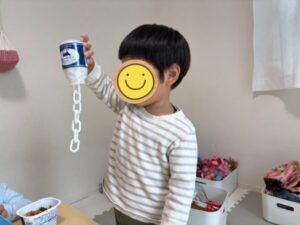 飲み物の容器やお菓子の箱など、廃材を使ったおままごとをしている様子です😊