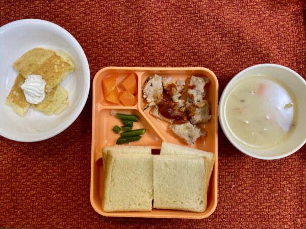 今日はお弁当箱に入れてみました🤗 パンとハンバーグ、にんじんグラッセとみんな良く食べてくれました✨ 豆乳スープはイマイチ人気がありませんでした😅