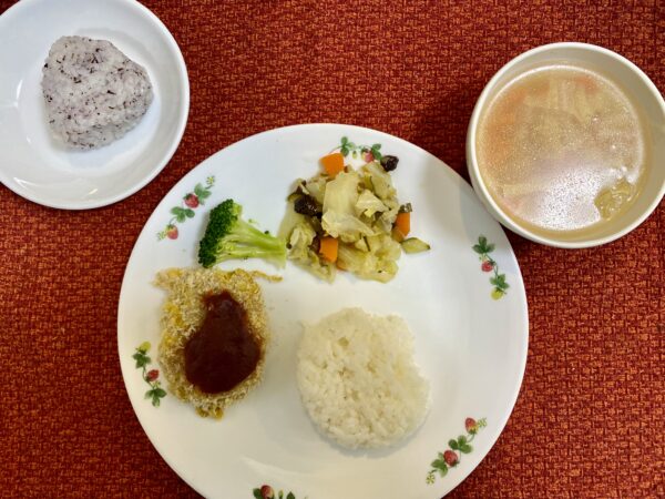給食✨ かぼちゃコロッケ キャベツサラダ 白菜のコンソメスープ
