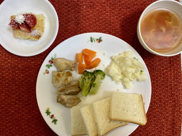 給食✨ ローストチキン マッシュポテト にんじんグラッセ ブロッコリー煮 ミネストローネスープ パン